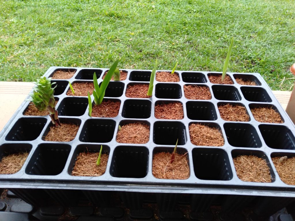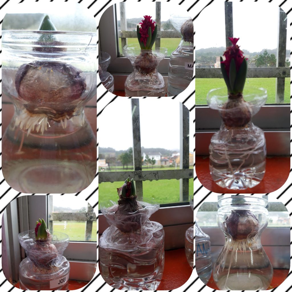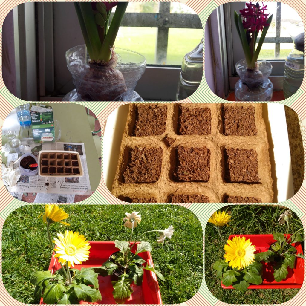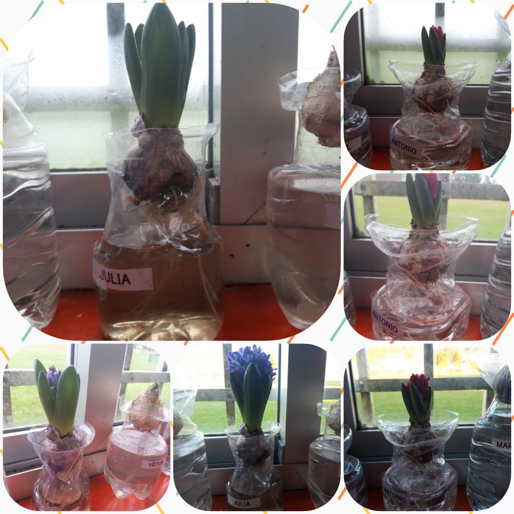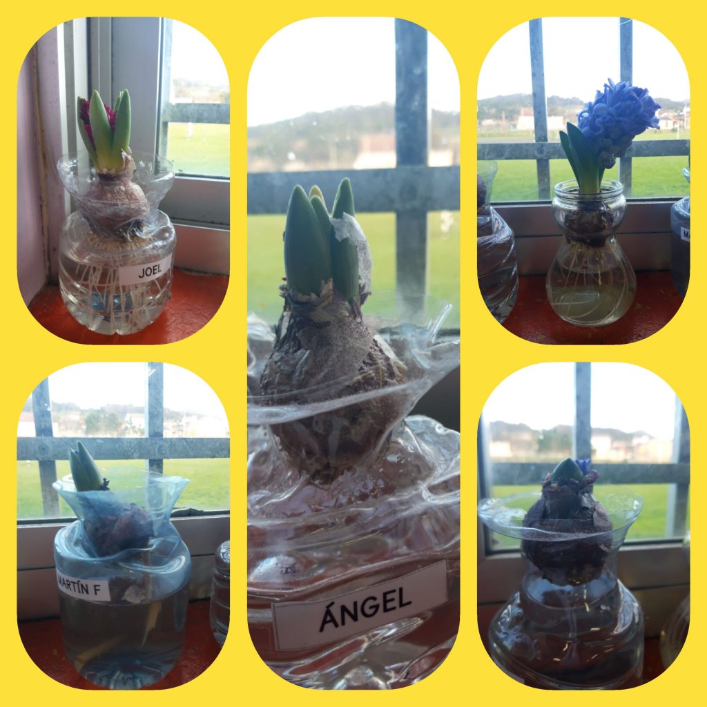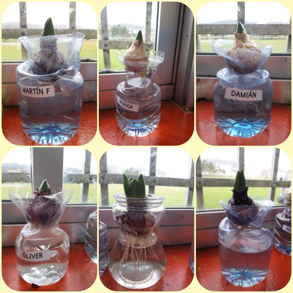 As primeiras son as que tiñamos na clase, e algunhas nenas e nenos tiveron a oportunidade de levalas para a casa e transplantalas, pero a maioría deles non. Por este motivo fixemos unha nova plantación, pero con este parón… Agora están na casa dunha compañeira, a ver se as podemos ver grandiñas á volta.